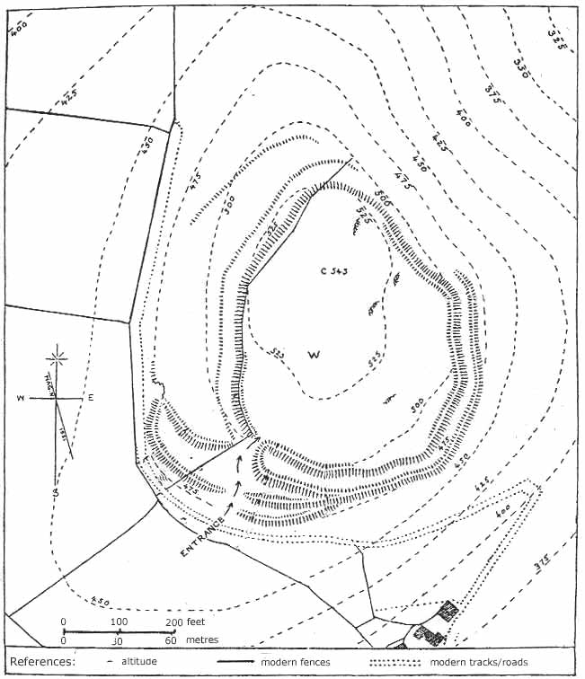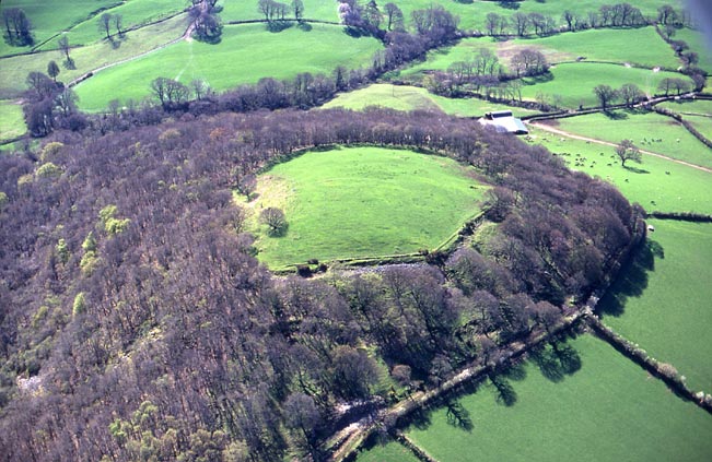 It is now called Craig Gwrtheyrn, as it is also known from the Exerpts of the Historia Brittonum. In some MSS, a later gloss is added: id est Din Gurtigirn. First, a look at the ruins as they appear today. On the Landranger map we can detect a small, circular fortification, enclosed in a small wood within the loop of the river Teifi. It sits on a detached rocky hill, rising 300 feet above the river, which makes the position a commanding and strong one. Even though there is slightly higher ground within half a mile both to the south-west and south-east. As one of the major hill-forts of the region, it belong to the so-called 'South Cardigan Group' of hill-forts. It encloses 1,5 ha and lies just south of the river Teifi to the east of Llandysul, although it is now unnamed on the Ordnance Survey map. The steep-sided hillfort is covered by trees, that hide the strong walls from view. The artificial defences consist of multiple ramparts, consisting of a multivallate rampart and a ditch. The primary defences which ringed the plateau originally consisted of dry masonry stone walling, sadly now robbed and demolished. The remaining rubble has mostly has fallen down the slope, some large boulders are still in place. The original measurements of this wall is now impossible to ascertain, but once it was 7-10 feet thick. Outside the main rampart and around most of the fort (save for the NE side, which is very steep) runs a ditch, which is however filled in with stones and rubble from the main rampart. Furthermore, beyond the ditch on the W and SW sides of the fort there were obstacle rampart with ditches. Lastly, on the SW side are the remains of an unexpected chevaux-de-frise (sharp stones, some 2 ft. long, set on end in the form of ramparts to act as an added defence). There are still about thirty of these spike stones left, but presumably there were ones many more, making the approach to the fort a difficult one. The stone ramparts had only one entrance on the SW with two barbicans (in turned passage to a hill-fort with gates at either end and guarded from the rampart above). There are springs within the interior area and around the foot of the hill. Although there has been ploughing in the main inhabited area, this did not turn up any finds. There has been no archaeological research to this date. Therefore a secure dating is not possible, so the possibility of Vortigern's presence here remains. Normally, the fort would be ascribed to the Pre-Roman Iron Age, and if the connection to Vortigern would be historical we should therefore assume that he did not build the fort, but re-fortified it. There are no historical sources to give us any further information. Nennius, usually held to be the author of the Historia Brittonum, is our first witness of the events, writing most probably in the early 9th century. But tying in his account to what scarce information we have of the 5th century provides us with many problems. It is almost certain that Germanus of Auxerre never visited these parts, and convincing arguments have been made about Germanus, bishop of Man, to have been the inspiration of the legend. Curiously, almost all the Caer Guorthigirns have a in their close neighbourhood a place-name linked to a cult of St Garmon. No exception here just about 500 ft. to the SW lies Fynnon Yarmon. What came first is now impossible to say, but there seems to have been an 8th-century cult linking sites associated to Vortigern with Germanus, or rather Garmon. This would mean that the name of the fort at least predates that cult. Another indicator is the part of the story where Vortigern perishes because of an immense blaze, started by fire from heaven. This fate is shared by Foel Fenlli, which was in the first place not associated with Vortigern, but included in the legends about St Germanus, and ruled by a similar tyrant who died by a heavenly ordeal which was instigated by the saint. The elements of this story as told by Nennius are very similar to this version of Vortigerns fate, so that a link may be found here (theres also a Llanarmon-in-Ial close to Foel Fenlli). But there is more to link the two in ordeal and in time. Curiously, the Annales Cambriae tell us of the destruction by lightning of the hillfort of Degannwy in 812: