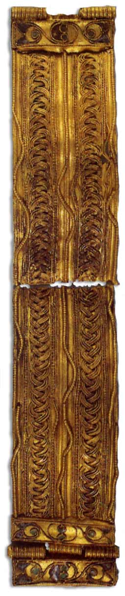 The Find On that fateful day, a young man from the Welsh village of Cwmdauddwr, by the name of James Marston happened to climb among the Carregwynion Rocks in the parish of Nantmel. He later stated he only meant to roll a stone downhill to scare the foxes out, which may have been a senseless act of bored vandalism in itself, but things turned out differently. When he took the iron bar he had with him and started to dislodge a piece of rock, he noticed that several pieces of material fell out of the crevice he just made. Gold! Our young man must have been both shocked and flabbergasted. Jewellery! Did he just make his fortune? As it turned out, our James must have been more of a gentleman than his playful acts with rocks seemed to make of him, or else something happened that made an honest man out of him. But most probably it was the reason that the find became known to a large audience! Anyhow, he turned his find over to the High Sheriff of the county. But not after he did send one piece of jewellery to London to be tested, which piece unfortunately was melted down in order to establish the amount of gold. And lo and behold, it was found to be 22.5 carat gold! Maybe this shocked our James into handing the lot over, or else well-meaning friends did. For British law stipulates that, if the true owner cannot be established, the find is declared a treasure-trove, and the finder gets the lot or most of it. This law, crated under Edward I, holds that when gold, silver or plate are found under certain conditions (such as dropping rocks down slopes), it is the duty of the coroner to hold an inquest to discover who is the finder and the owner. Anyhow, the High Sheriff, Col. Stephen W. Williams, notified the British Museum, and a coroners inquiry was held at Magistrate Room, Rhyader, in the presence of a large crowd. This inquest entailed that a jury would have to decide the true owner of the treasure, in accordance with the law I mentioned above. Our James testified that he had found the jewellery loose in the ground, and not in any case, and that he had handed the lot to the High Sheriff when he knew it was he duty to do so (I guess the word when is significant here..). The Sheriff confirmed this, after which Mr. Reed, Director-General of Antiquities of the British Museum, gave a written evidence that the pieces were clearly Roman, but with late Celtic work, and that our (by now) lucky man James, under a Treasury minute of 1886, was the full owner of the lot, minus 20 percent (but whos counting..). And a rich man no doubt, though nowhere is mentioned what the final value amounted to. The Treasure What did the treasure contain? The inquest reported one gold ring set with onyx and engraved on the setting an ant, a portion of a gold necklet of nine pieces (eight links set with stones and one stone with the link missing), one piece of gold scroll, a small piece of embossed gold (both forming part of the necklet) and a gold armlet in four pieces. They were described by the High Sheriff (who thus proves to have been an antiquarian or at least a kind of expert in ancient artwork) in the following way: The Ring is distinctly of Roman workmanship. The onyx with which it is set has been engraved at a very early period. This can be seen by the fact that the interior of the engraving is highly polished a characteristic of Egyptian, Greek and Roman times. (Click here to enlarge) Later comment from the British Museum: The ring has a thick loop expanding at the bezel which is set with an intaglio of banded onyx engraved with an ant. Diameter 2.7 cm. The stones with which the necklet are set are carnelians with the exception of two, which are blue stones of an unknown quality, one possibly being an amethyst or a sapphire, but more probably of blue paste. Between each section of the necklet set with stones is a small plate of embossed gold with somewhat peculiar ornament thereon of Celtic type. The filigree work round the stones is of very beautiful character, composed entirely of exceedingly small granules of gold, fused together very much after the type of some of the Etruscan jewellery in the British Museum. Each section has been hooked together with hooks and eyes which are covered by the gold plates. The necklet is incomplete. The portion which has been found consists of nine sections, one stone is missing. It would rather appear as if the person who hid it had only obtained a portion as his share of the loot, and one armlet and a ring. Originally the treasure consisted of a complete necklet, two armlets, a ring, and possibly other articles of jewellery, and in dividing the spoil this appears to have fallen to the person who hid it in the rocks. (Click here to enlarge) Later comment from the British Museum: The necklet has a diameter of 34.5 cm. The armlet is of distinctly different character from the work in the necklet. It is a solid plate of gold with interlaced wire-work, the pattern being of the same character, and resembling the work upon Celtic crosses of Wales. It was originally in two pieces, hinged together and fastened probably by a gold peg attached to a delicate chain, forming part of the armlet. The clasps or hinges are ornamented with scroll work of most distinctly late Celtic work. The scroll has conventional leaves, filled with green and blue enamel. It is also ornamented with three lines of granulated work and four lines of twisted wire. It is altogether a most admirable specimen of Celtic art. The work shows great refinement and delicacy of design, and is quite equal to anything that has been found in Great Britain, and is surpassed by none of the very beautiful gold work in the Copenhagen Museum, where there are such specimens of gold ornaments of the Viking age. (Click here to enlarge) Later comment from the British Museum: The bracelet has a length of 17.8 cm. Col. Williams deplored, in my mind rightly, that one of the clasps had been melted down to ascertain the amount of gold. The ba