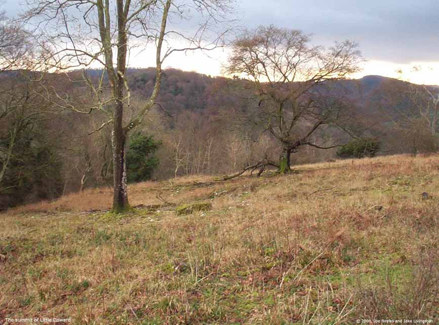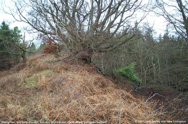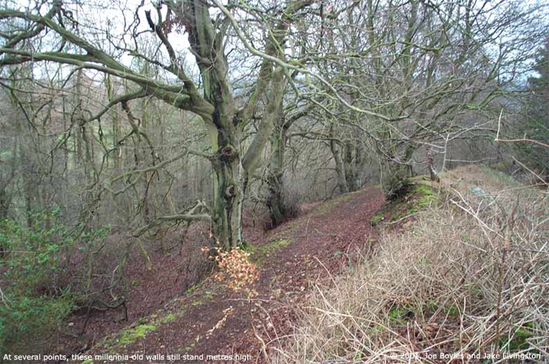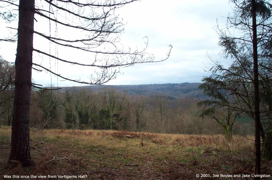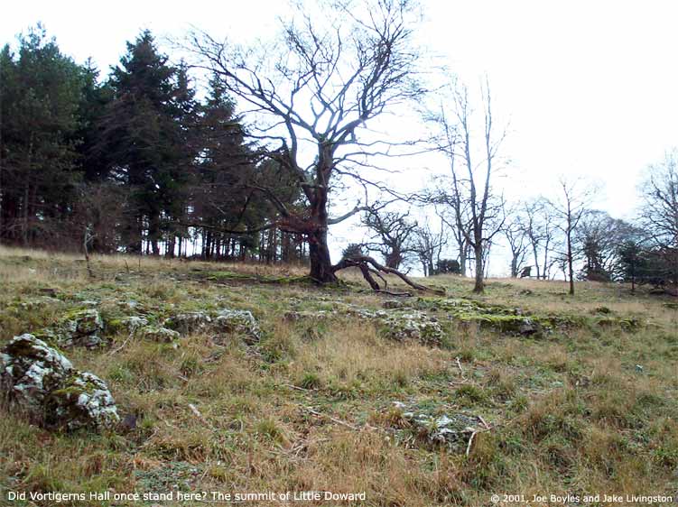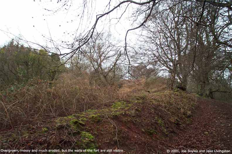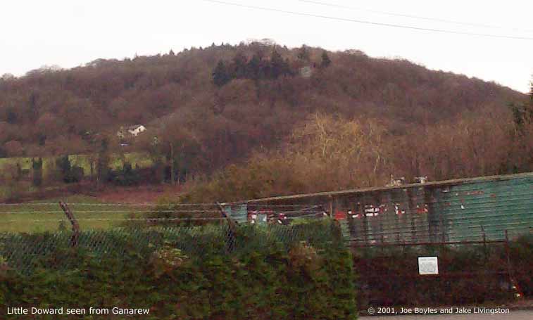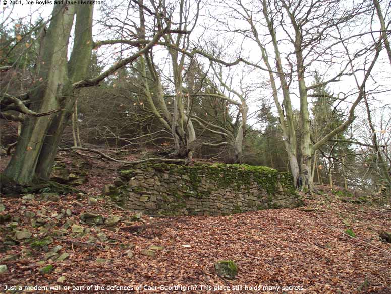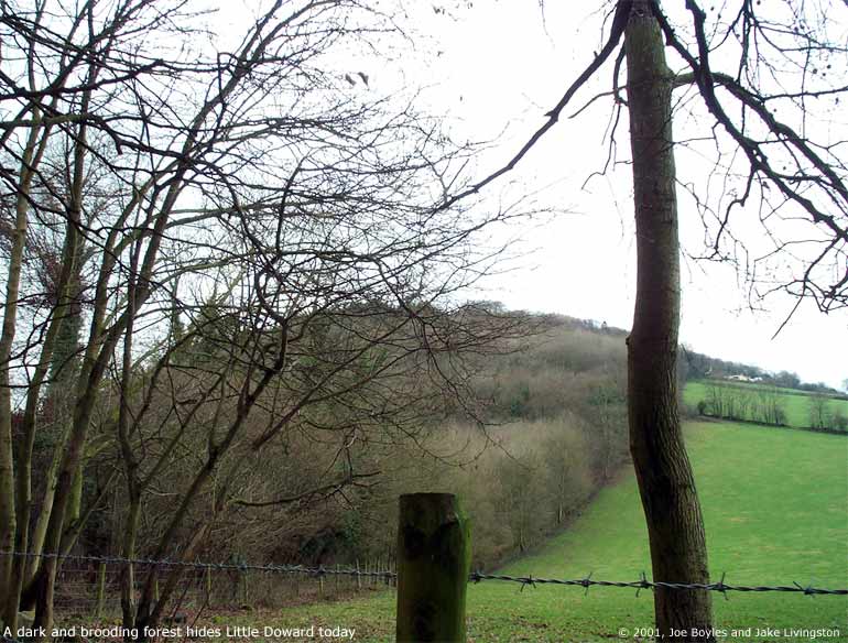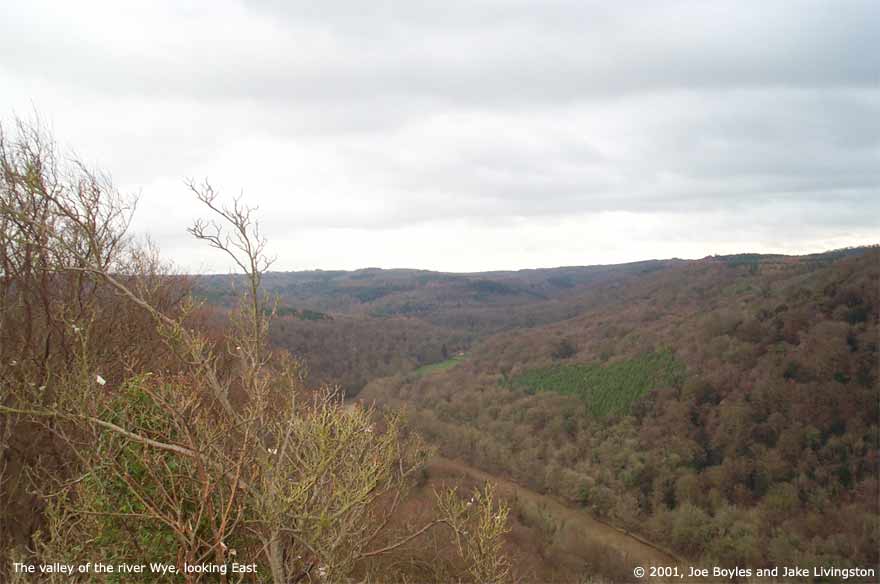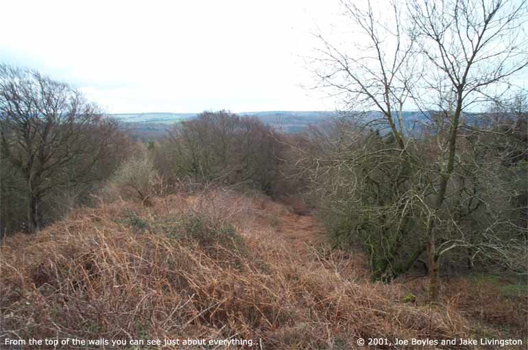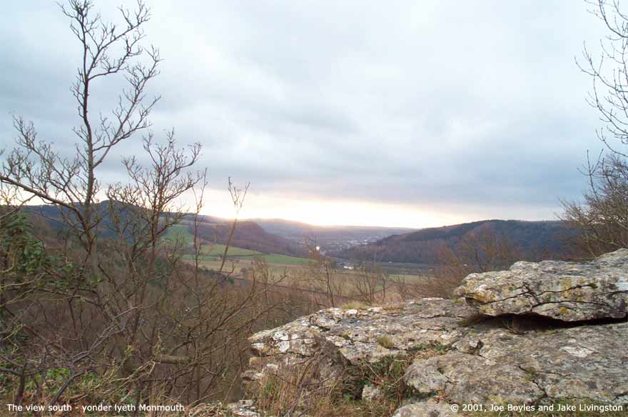 After the cave, we proceeded to Little Doward Hill (where we originally searched for the cave). At the top is the little Doward Fort, claimed by some to be Voritgern's ill-fated castle (burned by Ambrosius). We parked behind the same house as last time, but we hiked up. The mud was thick and slippery, but we were rewarded for our perseverance by the many deer we saw as we neared the top of the hill. The actual remains of the fortress consist of two partial ramparts. Not much to look at really. The embankments are overgrown with prickly thorn bushes and ferns. On the Southwest side, though, the natural defenses are quite impressive. The hilltop ends in a 60-foot drop before rolling somewhat less steeply to the valley. The view was incredible with the River Wye cutting through the valley and the city of Monmouth in the distance. Copyright © 2001, Joe Boyles and Jake Livingston. All rights reserved. Used with permission. Comments to: Jake Livingston and Joe Boyles. Visit Joe &