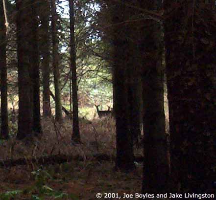 We could see Little Doward the hill from Arthur's Cave, and it was a looong way from this "official" car park. We decided it'd be easiest to drive up to where we were last year and just go up. How hard could it be to find a fort on the top of a hill? We drove back over there and parked only feet away from where we had last time. We uploaded the pics to our perfectly functioning computer then began hiking up. We got to a forest of fir or something (I'm no botanist) that looked regular and planned like it was harvested every so often. Then Joe saw something dart through the trees. Probably just a wolf or a bear or something. We kept moving. There it was again; this time there were more. Closer inspection revealed a group of three or four deer--all does and fawns, no big bucks. Soon we were seeing several groups like this and probably saw fifteen deer ( click here to enlarge) the whole time we were up there. We tried to get some good pictures of them, but they were pretty alert.
