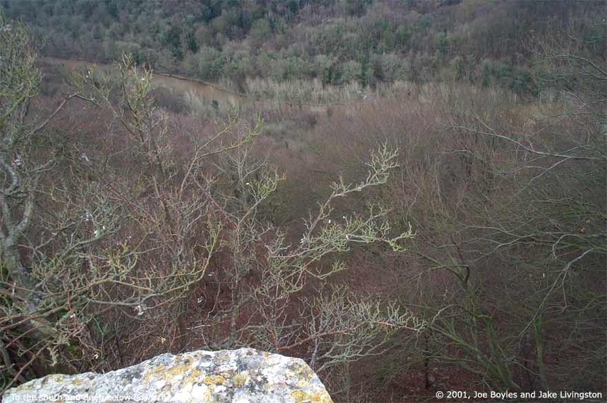 We kept hiking up the hill and came to some real steep parts that, once we looked down at them from the top, looked like the old familiar banks and ditches, though overgrown with scrubby things and brambles. We walked along these because, if we know hillforts, the banks usually form the circumference and would thus lead to the rest of the fort. The interior at this section was overgrown with trees and grasses and didn't look much like a fort top. Nothing like Cadbury, certainly. So we walked around the rest of the top and eventually got to the southeast extremity of the fort top, an area cut off from the rest of the hill by sheer rock cliffs 30-40 feet high, affording absolutely incredibly breathtaking views of the Wye Valley. There was this one pillar of rock off by itself that we managed to get out to that made me feel like I was in a soap commercial or something. This was near an open, cleared area of the fort top that looked more like a fort top. Joe's Journal